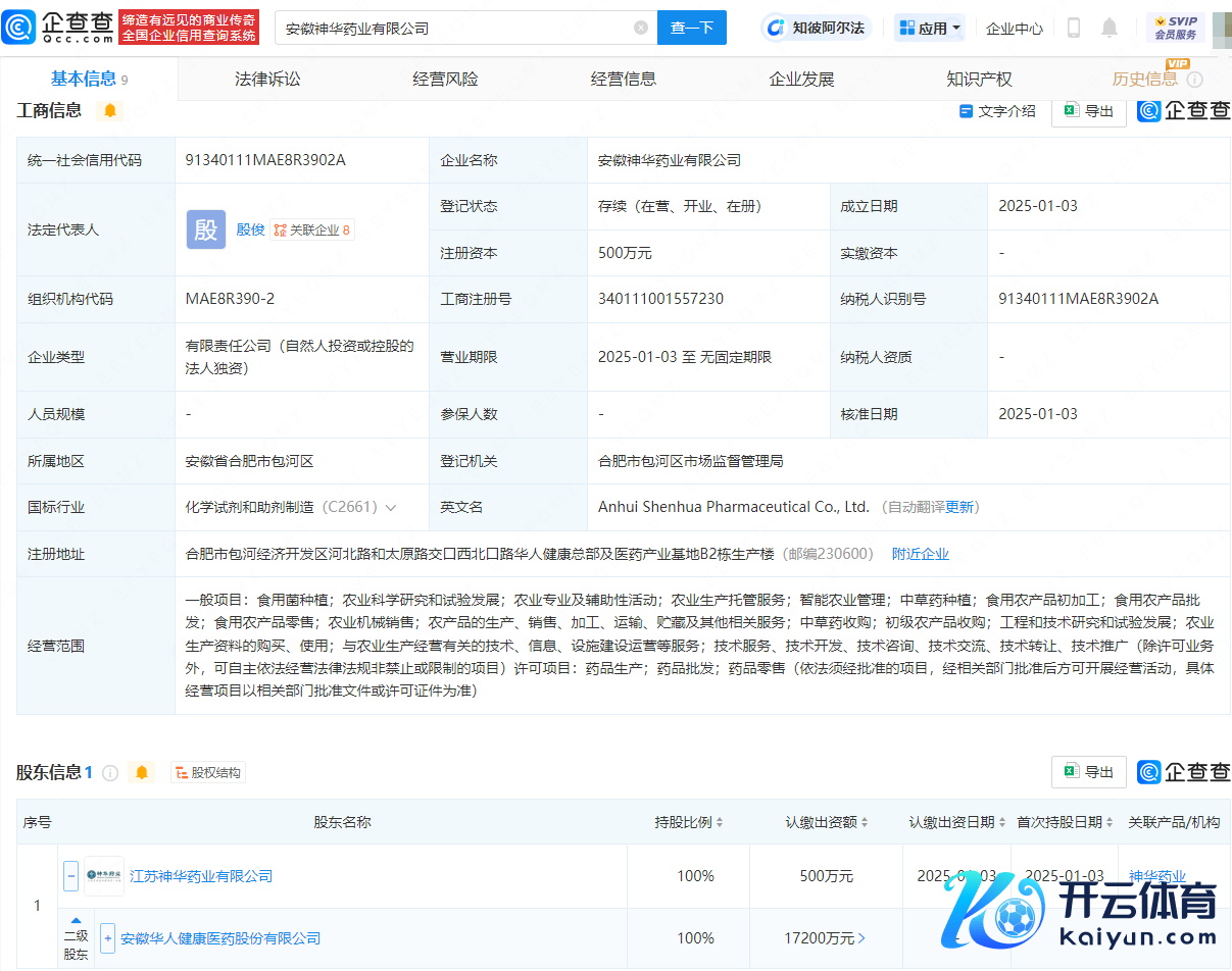 企查查APP涌现万博manbext体育官网app(中国)官方网站,近日,安徽神华药业有限公司诱骗,法定代表东谈主为殷俊,注册成本为500万元,蓄意范围包含:食用菌接济;农业科学究诘和检察发展;农业分娩托管管事;智能农业处罚;中草药接济;食用农产物初加工;中草药收购等。企查查股权穿透涌现,该公司由华东谈主健康(301408)盘曲全资握股。